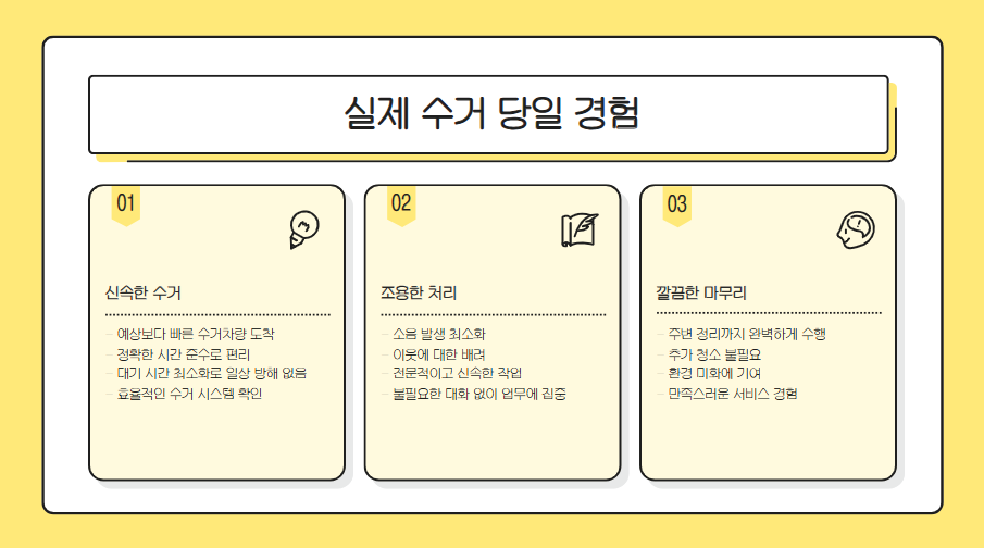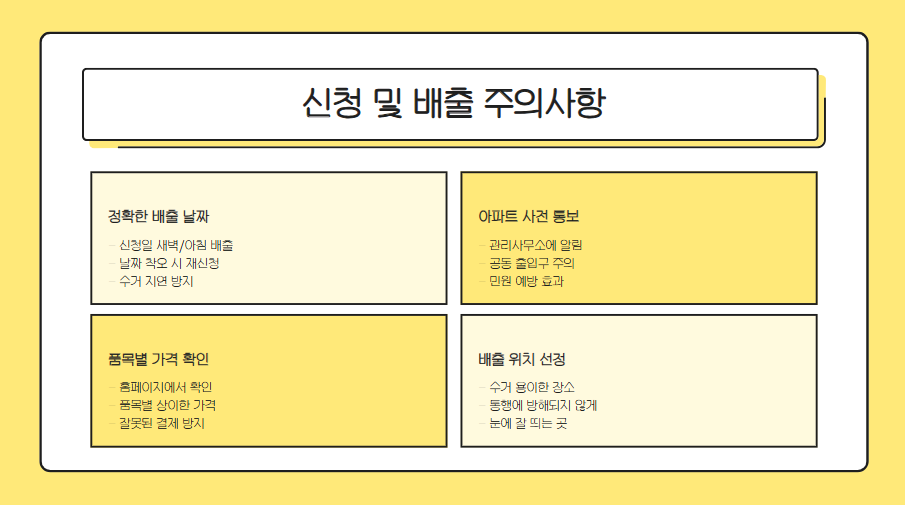 제가 한 번 실수했던 게 바로 배출 날짜 착오였습니다. 신청 날짜보다 하루 먼저 내놓았더니 수거가 되지 않았고, 결국 다시 신청해야 했어요. 신청한 날짜의 새벽 또는 그날 아침에 맞춰 정확히 배출해야 합니다. 특히 아파트의 경우, 관리사무소에 미리 이야기해두면 좋습니다. 공동 출입구 근처에 물건을 두면 민원이 발생할 수 있으니까요.