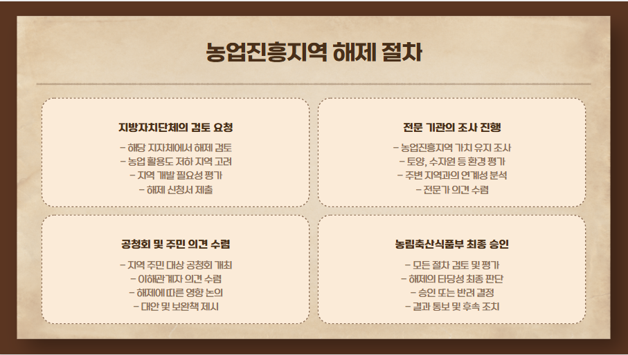 어떤 지역에서는 농업진흥지역 해제가 필요할 수도 있습니다. 예를 들어, 해당 지역에서 농업 활용도가 낮아지거나 지역 개발이 불가피한 경우 해제가 검토될 수 있습니다. 해제 절차는 다음과 같습니다.