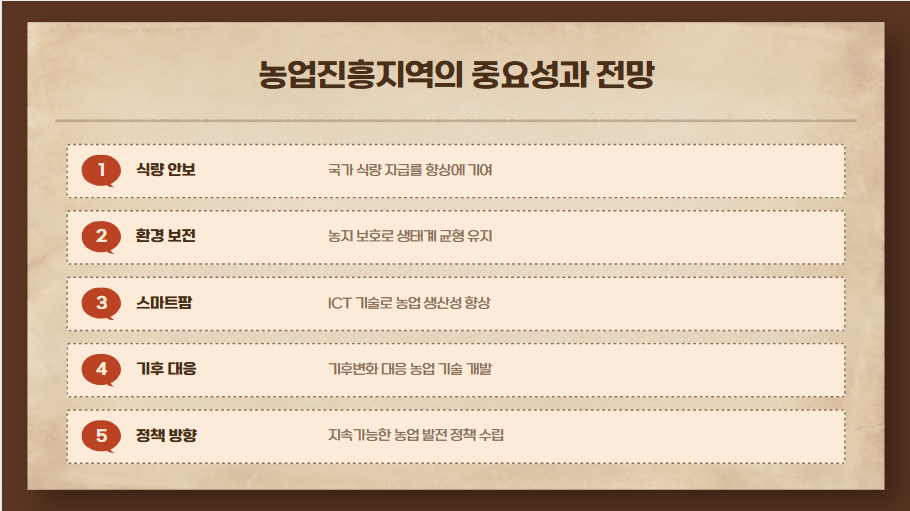 농업진흥지역은 국가의 식량 안보를 책임지는 중요한 역할을 수행하며, 지속 가능한 농업 발전을 위해 정부의 꾸준한 지원이 필요합니다.