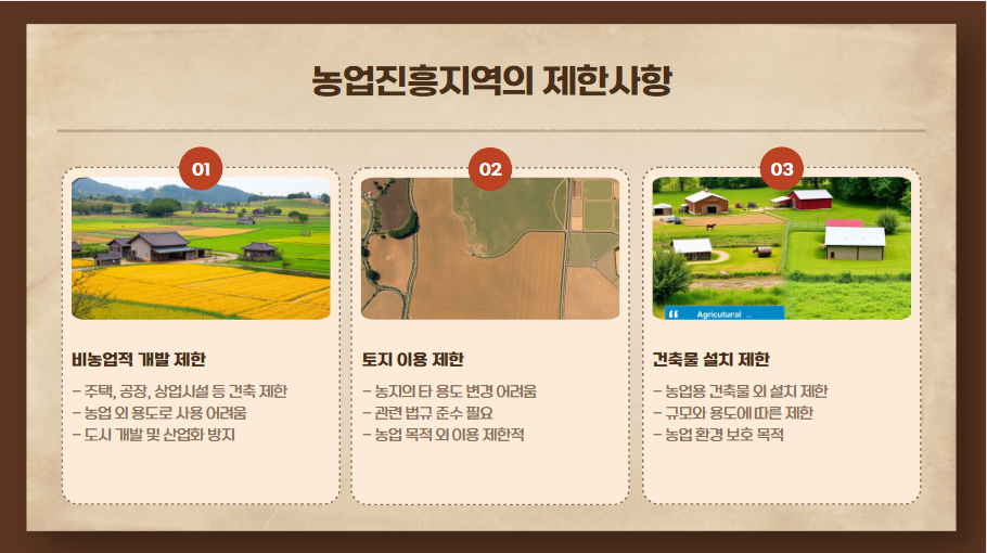 비농업적 개발 제한: 주택, 공장, 상업 시설 등의 건축이 제한되며, 농업 외 용도로 사용하기 어렵습니다.