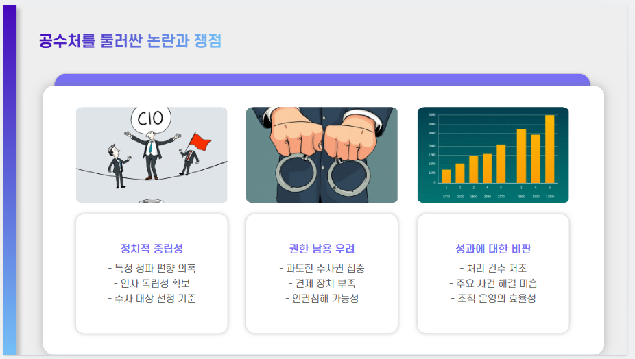 - 정치적 중립성 문제: 공수처가 특정 정치 세력에 치우쳐 있는 것이 아니냐는 의혹이 제기되고 있습니다.