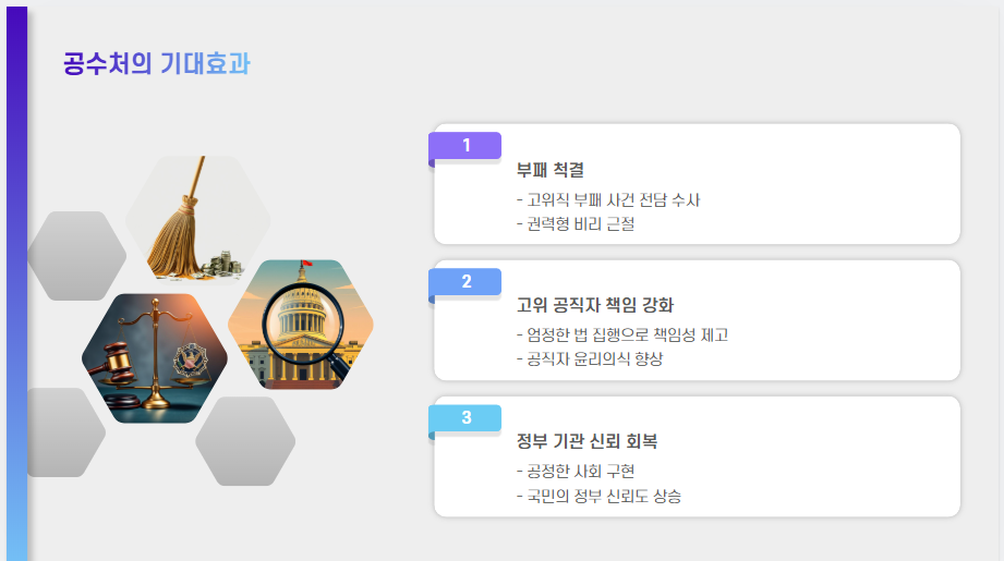 공수처의 설립은 부패 척결과 투명성 강화에 대한 대한민국의 의지를 상징합니다.