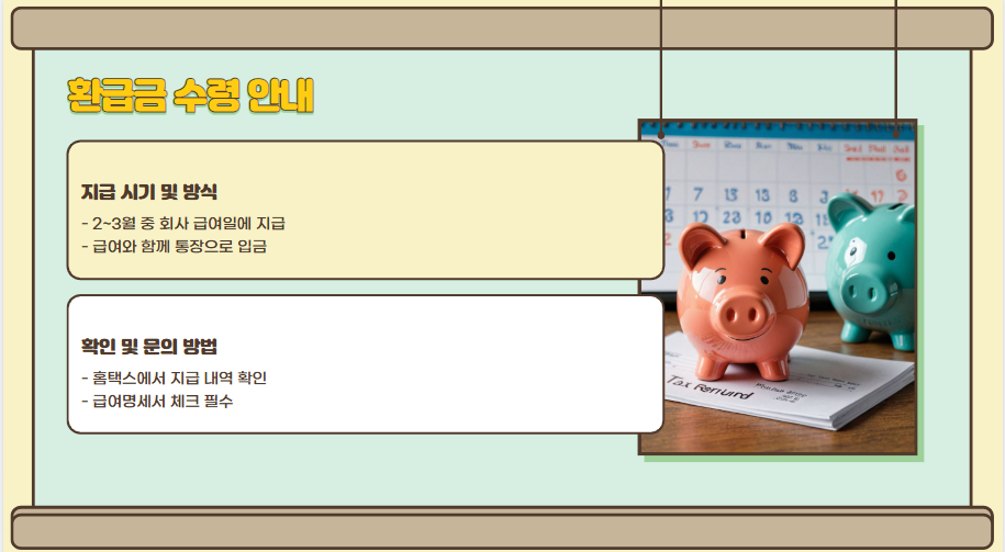만약 환급금이 예상됐는데 지급되지 않았다면, 회사 인사팀에 문의하거나 홈택스에서 지급계좌가 정확히 등록되어 있는지 확인해 보세요.