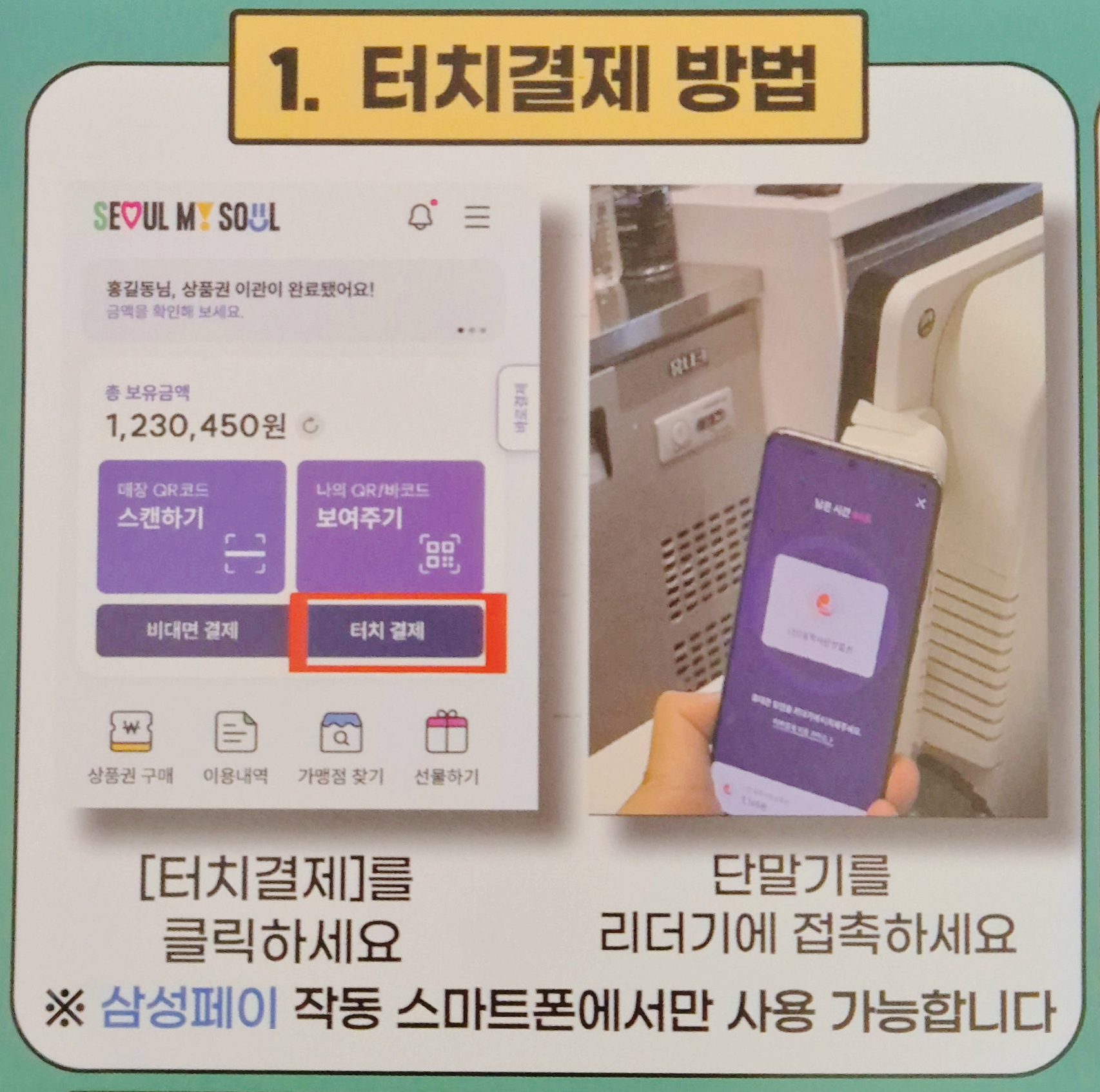 삼성페이가 작동하는 스마트폰을 가지고 계시다면 카드 결제 하듯 터치결제를 누른 후 단말기 리더기에 접촉합니다.