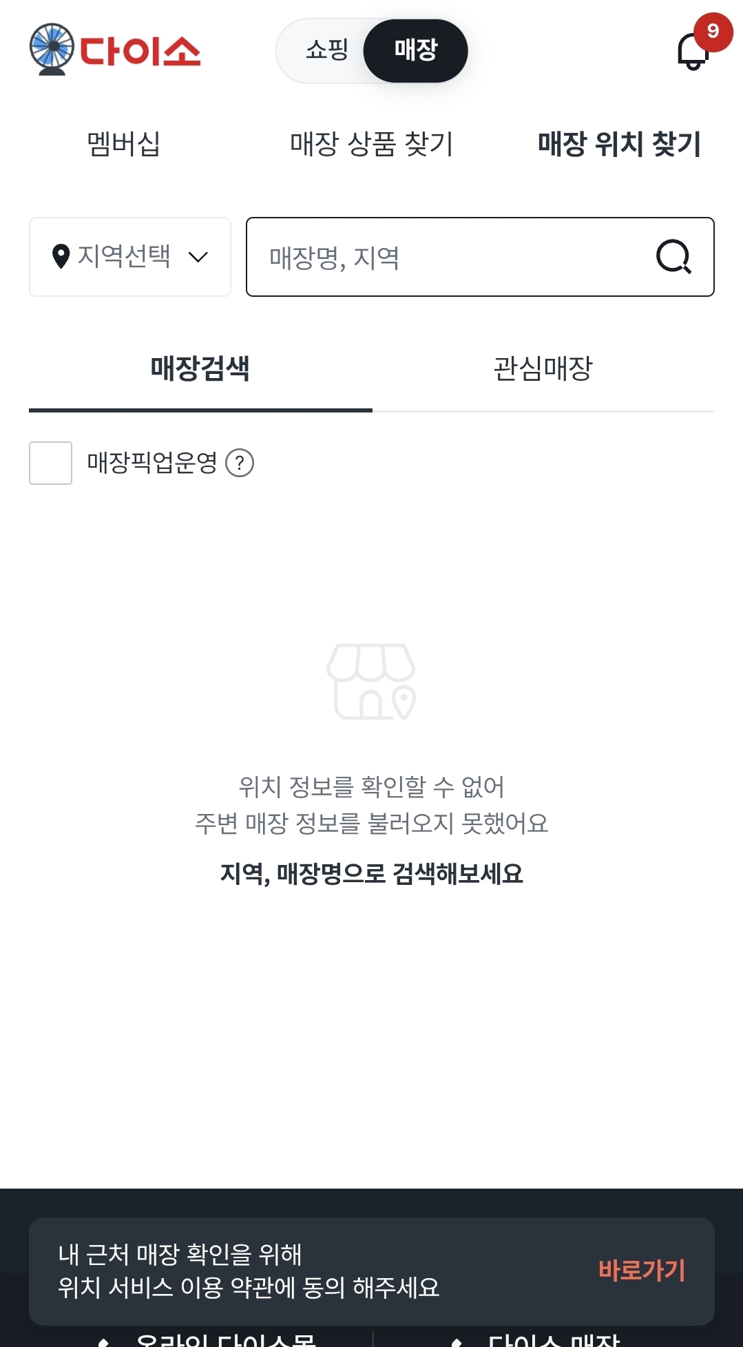 화면 상단 오른쪽에서 ‘매장 위치 찾기’ 버튼을 눌러주세요.
