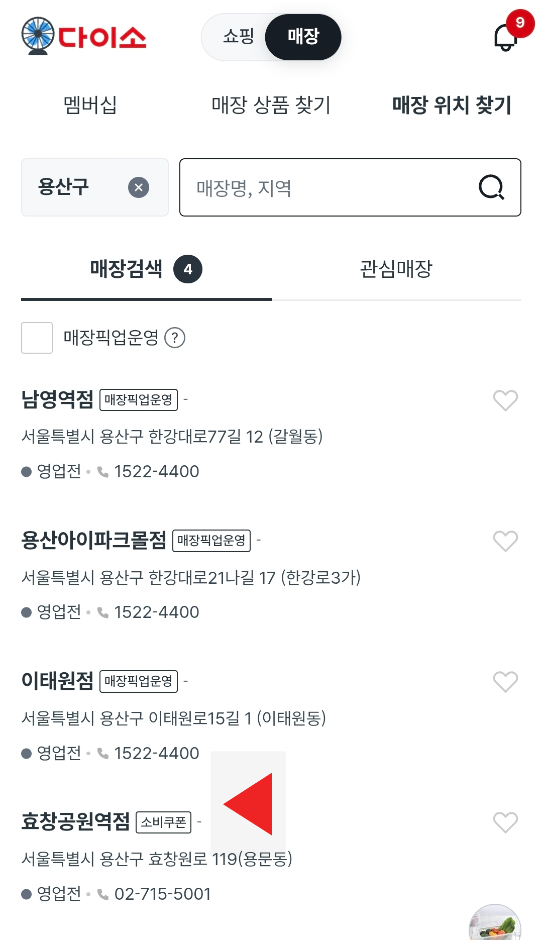 예를 들어 서울 용산구를 검색하면 그 지역에 있는 다이소 매장 목록이 쭉 뜹니다.