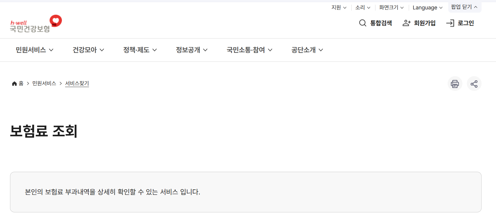 - [보험료 조회/납부] → [직장/지역 건강보험료 조회] 클릭