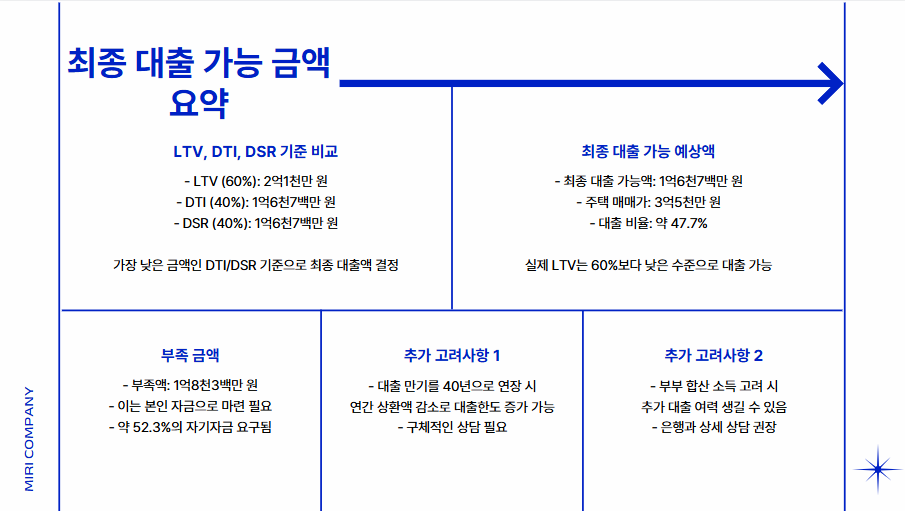 또한 부부합산 소득을 고려하면 추가 대출 여력이 생길 수 있으니 이 부분도 함께 검토해 보시기 바랍니다.