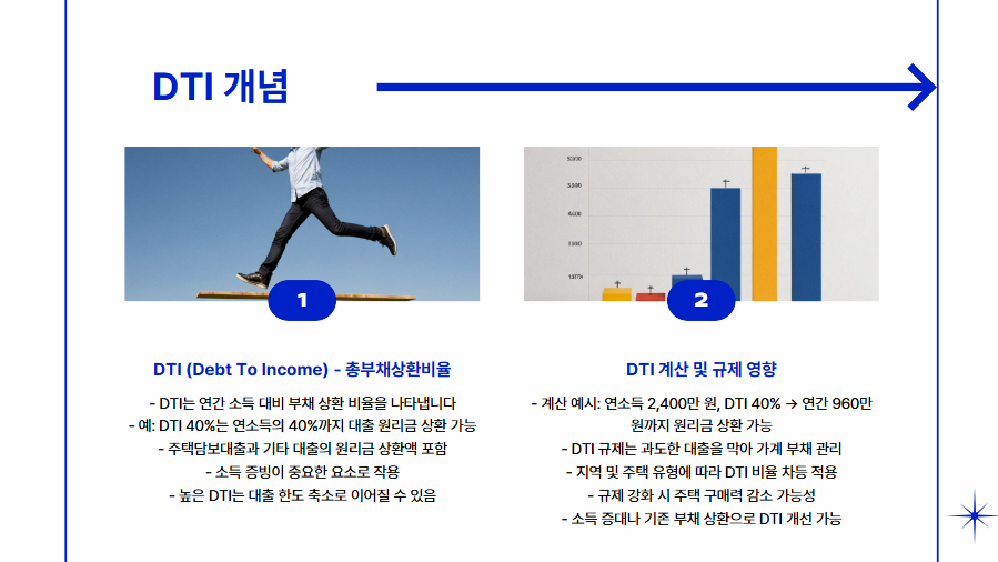 예를 들어 DTI가 40%라면, 연소득의 40%까지만 대출 원리금 상환에 사용할 수 있습니다.