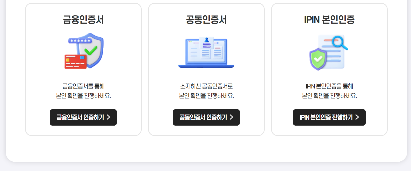 간편 인증, 휴대폰인증, 금융인증서, 공동인증서, IPIN 본인인증 중 원하는 인증 방법을 택하여 인증을 합니다. 현재 SK유심 유출사건으로 인하여 혹시 변경 전 SK유심을 사용 중이시라면 휴대폰 인증은 권하지 않습니다. 다른 인증을 이용하세요.