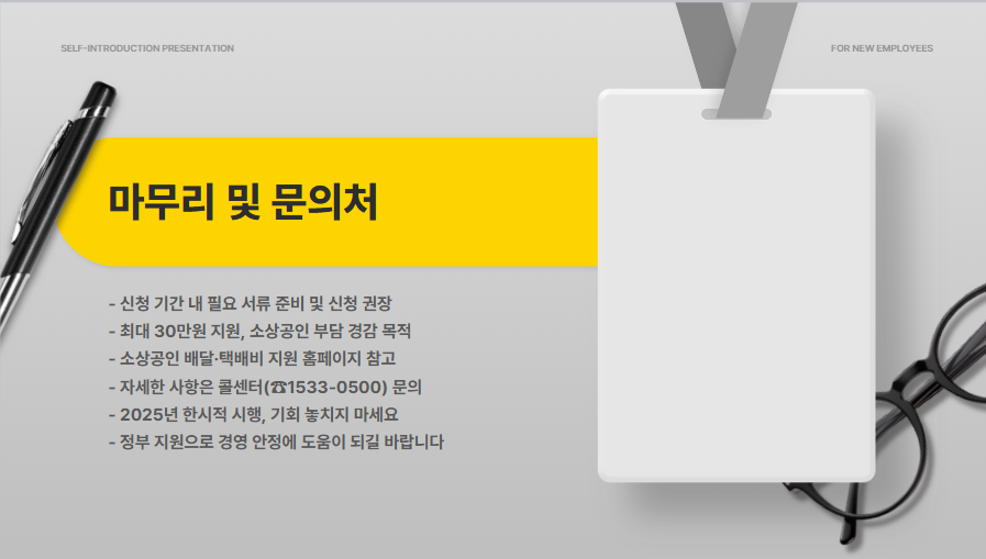 이번 지원사업은 배달 및 택배비로 인한 소상공인의 부담을 줄이기 위한 정부의 노력입니다. 신청 기간 내에 필요한 서류를 준비하여 신청하시기 바랍니다. 자세한 사항은 소상공인 배달·택배비 지원 홈페이지를 참고하시거나, 소상공인 배달택배 지원 콜센터(☎1533-0500)로 문의하시기 바랍니다