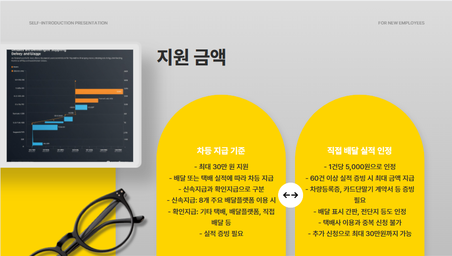 - 직접 배달 실적 인정: 1건당 5,000원으로 인정되며, 60건 이상의 실적 증빙 시 최대 금액 지급