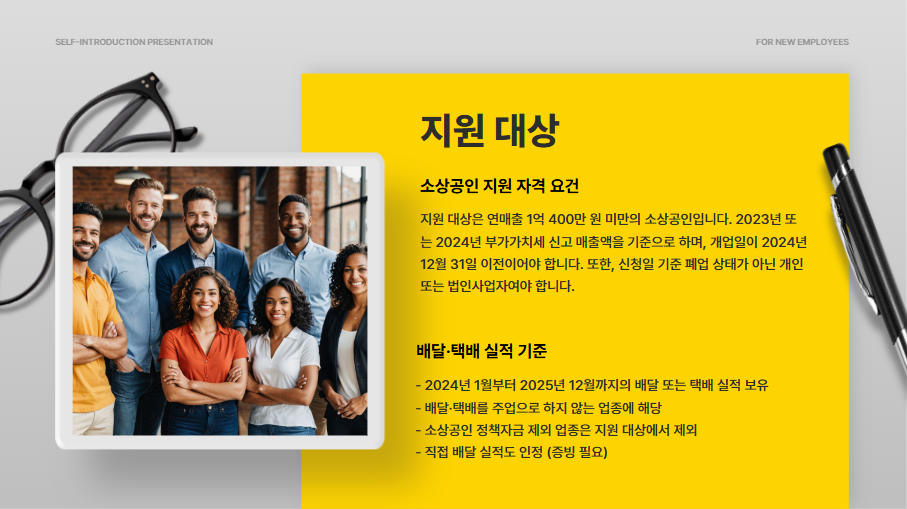- 배달·택배를 주업으로 하지 않는 업종: 배달을 주업으로 하는 업종 및 소상공인 정책자금 제외 업종은 지원 대상에서 제외