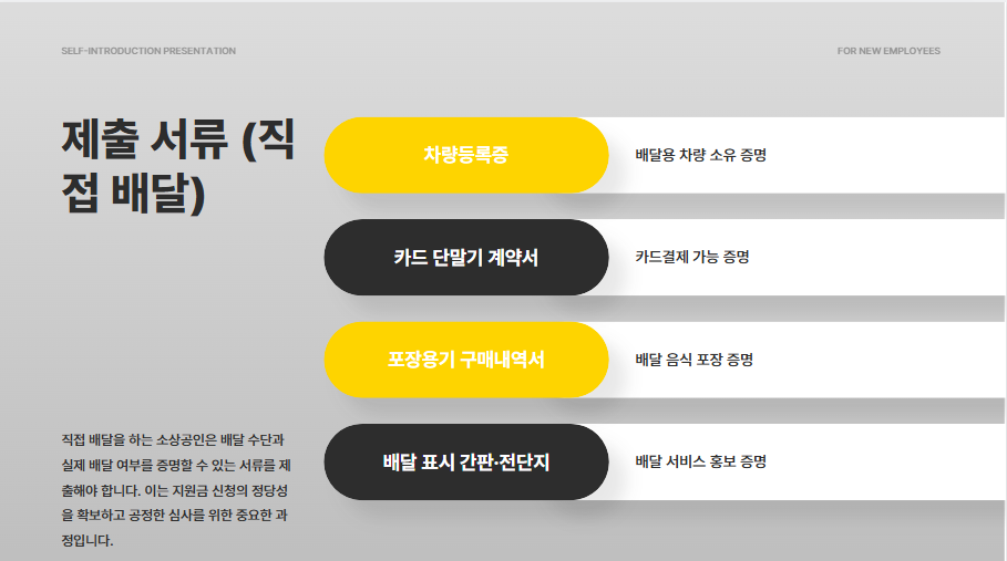 (직접배달) 직접배달 기반(수단) 확인증빙 + 배달실적(건수) 증빙 - 배달택배사와 직접배달을 둘 다 운영하는 경우, 둘 중에 배달택배비 실적 증빙이 유리한 한 개만 택일해서 신청
