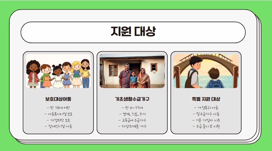 - 보호대상아동 : 만 18세 미만의 아동복지시설(아동양육시설, 공동생활가정) 보호아동, 가정위탁 보호아동, 장애인생활시설 아동, 소년소녀가정 아동