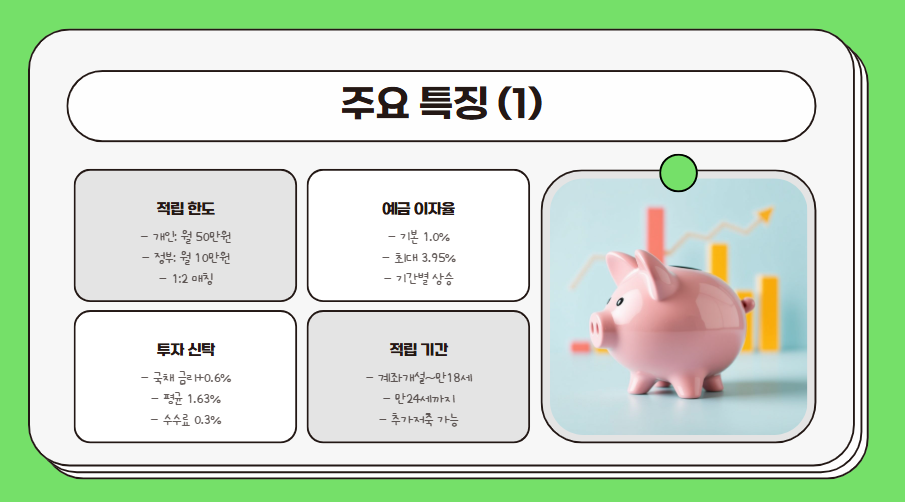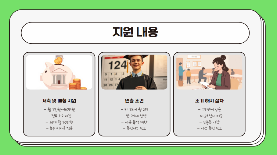 적립 한도: 개인 저축은 월 1,000원~50만 원, 정부 매칭은 월 최대 10만 원