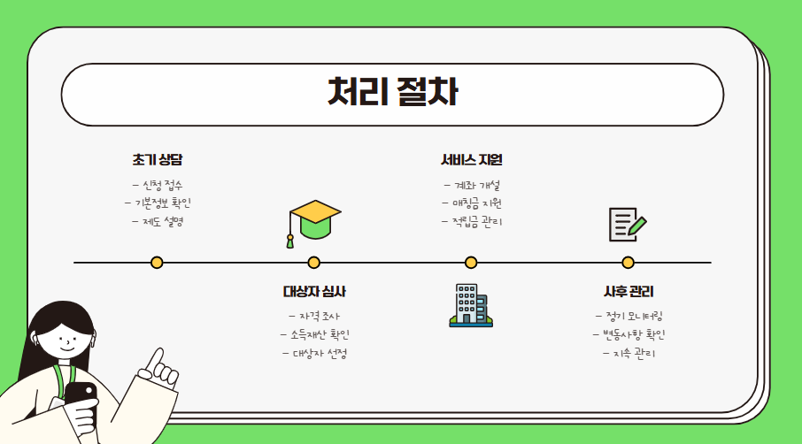 - 관리 및 조치: 초기 상담, 대상자 심사, 매칭 지원, 사후 관리 포함