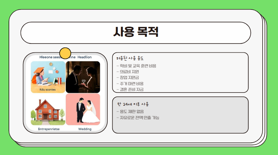 디딤씨앗통장은 자립을 위한 다양한 항목에 사용할 수 있으며, 만 24세가 되기 전까지는 사용 목적이 제한됩니다. 허용된 용도는 다음과 같습니다: