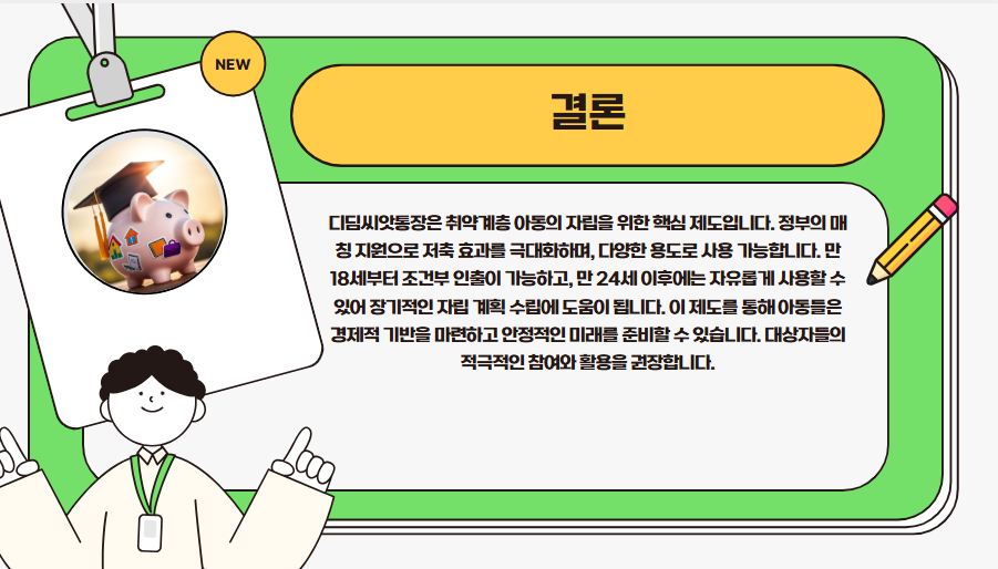 디딤씨앗통장은 아동이 성인이 되어 자립할 수 있도록 경제적 기반을 마련하며, 학업, 주거, 창업 등 다양한 분야에서 안정적인 성장을 지원합니다. 초기 비용 마련과 자립 준비를 위해 이 제도를 적극 활용하시기 바랍니다.