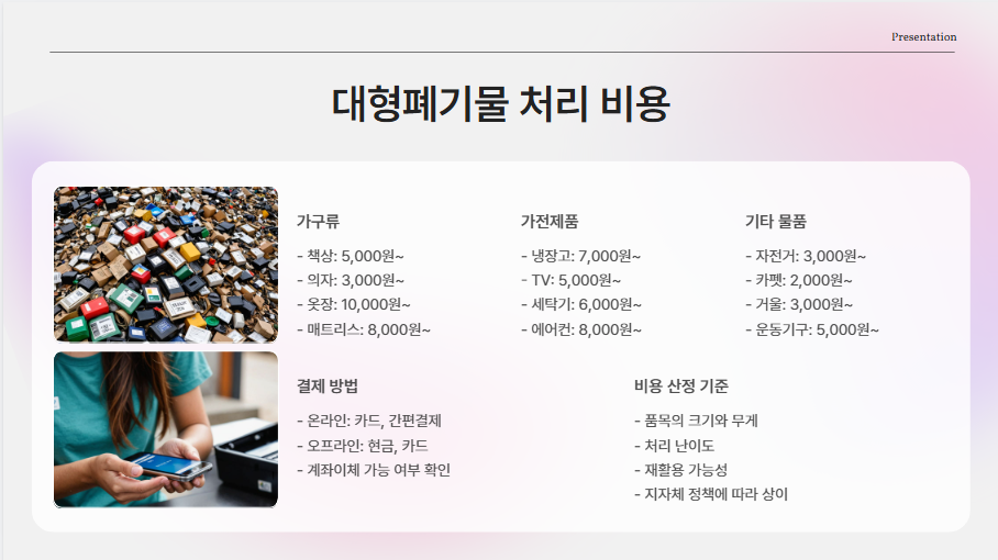 이야기를 시작하기 전에, ‘대형폐기물’의 기준을 먼저 짚고 가야 해요. 대형폐기물은 일상적인 쓰레기봉투에 담기 어려운 크기의 물품을 의미합니다. 대표적인 예로는 책상, 의자, 옷장, 매트리스, 전자렌지, 자전거 등이 있죠. 용산구 역시 서울시 기준을 따르며, 각 물품마다 스티커 가격이 달라지는 구조입니다.