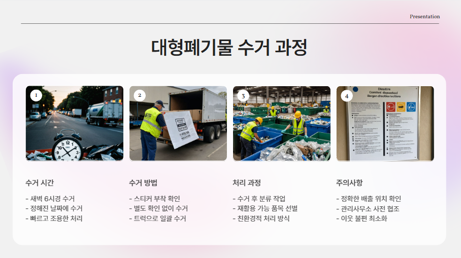 정해진 날짜 새벽 6시쯤, 수거 트럭이 와서 깔끔하게 물품들을 가져갔습니다. 예상보다 빠르게, 조용하게 처리되어 이웃들에게 방해가 되지 않았어요. ‘용산 대형폐기물스티커’만 정확히 부착되어 있으면, 별다른 확인 없이도 수거가 진행되기 때문에 너무나 간편했습니다.