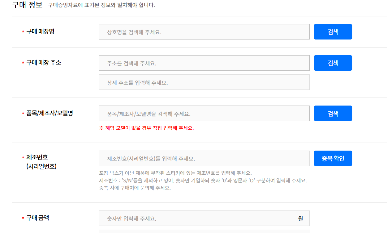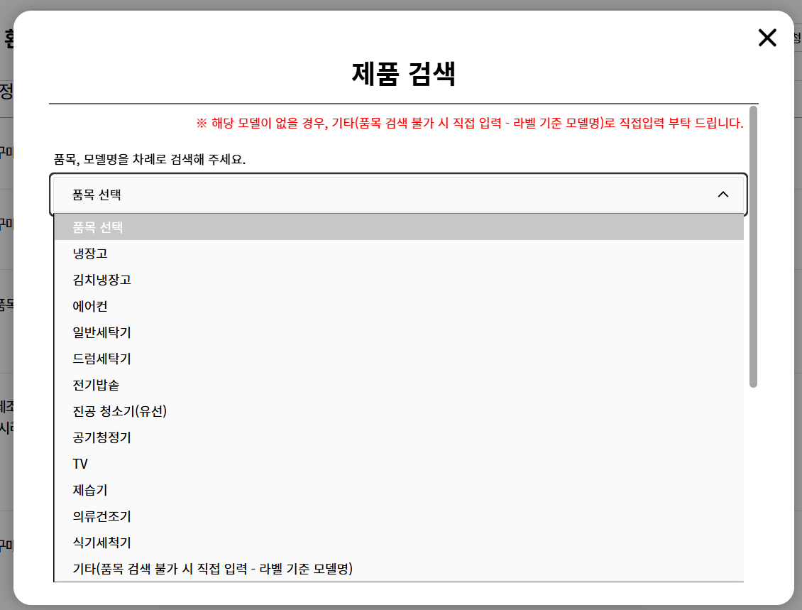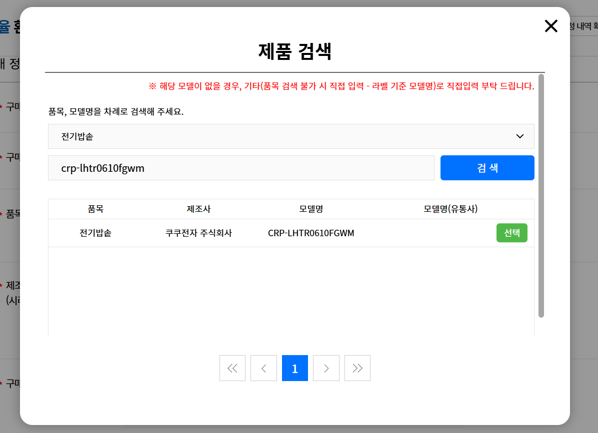 모델명을 정확하게 입력 후 검색합니다. 검색해서 내 제품이 나오면 선택해 주세요.