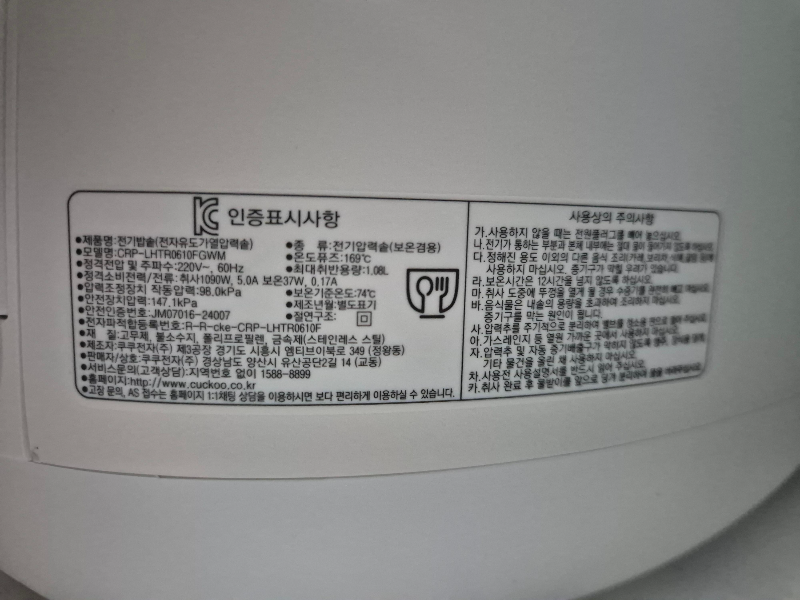 쿠쿠 전기밥솥은 바닥에 시리얼 넘버가 있습니다.
