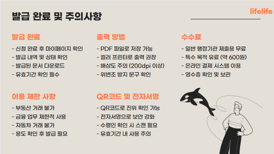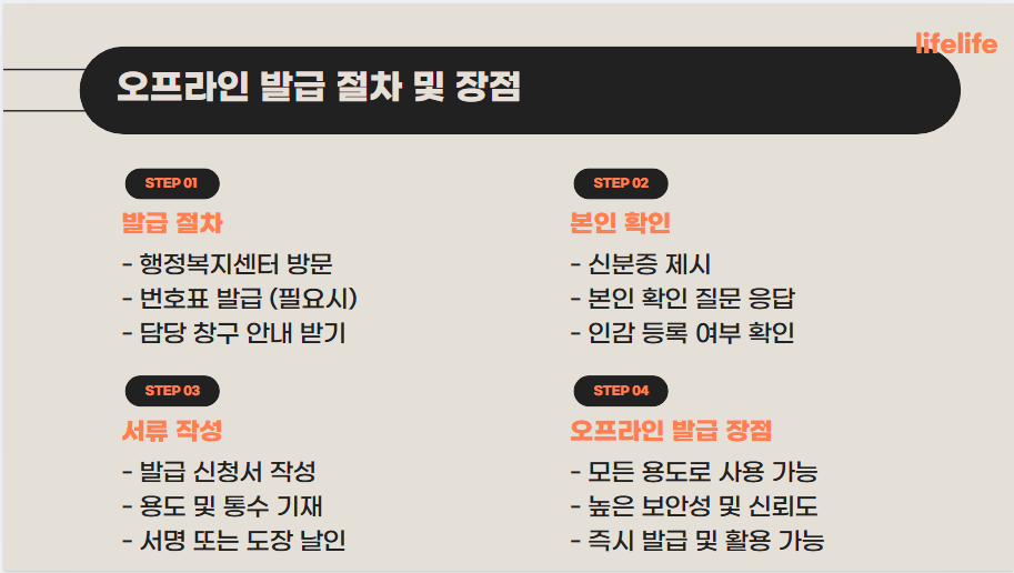 오프라인 발급: 부동산 거래, 금융 기관, 자동차 관련 업무 등 대부분의 용도
