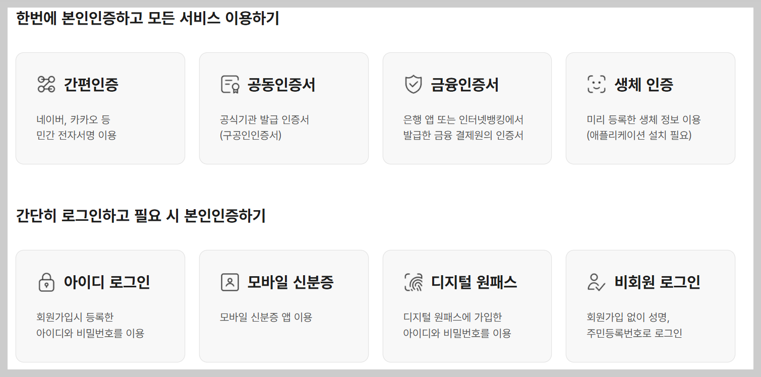 공동인증서(구 공인인증서) 또는 금융인증서 필요합니다. 간편 인증이나 아이디로그인도 가능하나, 인감증명서 발급 시에는 다시 공동인증서 (구 공인인증서) 또는 금융인증서 중 하나를 인증해야 합니다.
