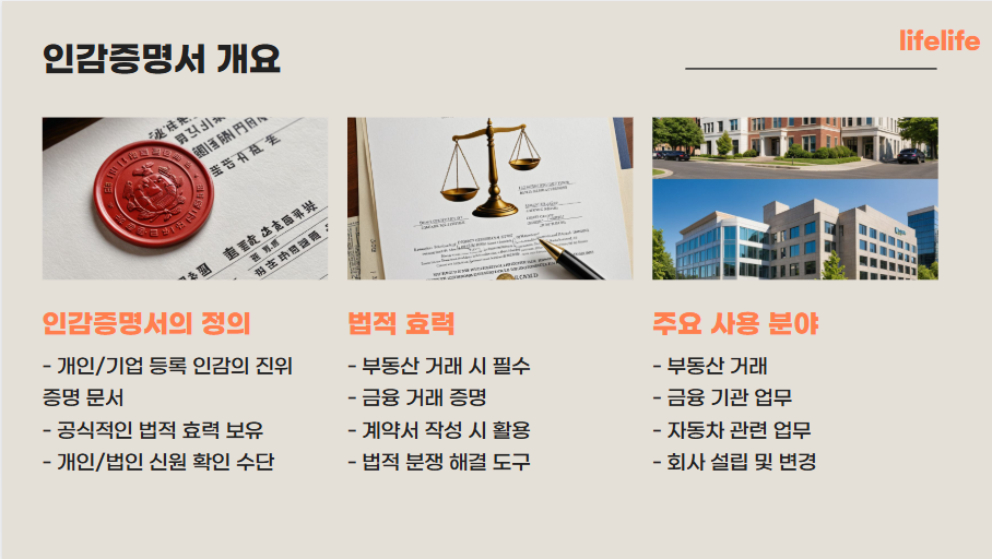 인감증명서는 개인 또는 기업이 등록한 인감의 진위를 증명하는 공식 문서입니다. 법적 효력이 있어 부동산 거래, 금융 거래, 계약서 작성, 자동차 관련 업무 등 다양한 분야에서 사용됩니다. 이러한 이유로, 인감증명서는 신뢰성과 보안성이 매우 중요한 문서 중 하나로 간주됩니다.