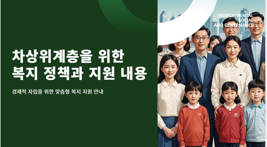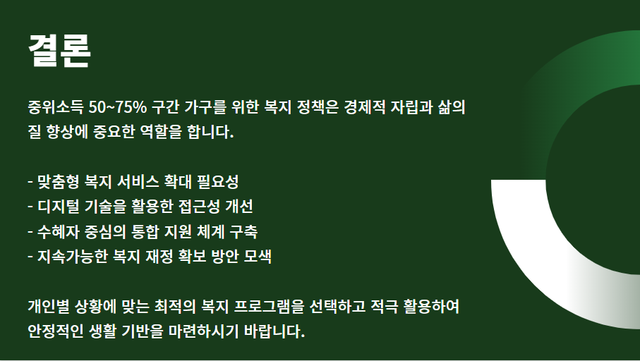 차상위계층인 중위소득 50~75%가구를 위한 복지정책은 경제적 자립과 삶의 질 향상에 중요한 역할을 합니다. 맞춤형 복지 서비스를 확대하고 디지털 기술을 활용한 접근성을 개선해야합니다. 수혜자 중심의 통합 지원을 체계적으로 구축하고 지속가능한 복지 재정 확보를 위해 방안을 모색해야 합니다. 개인별 상황에 맞는 최적의 복지 프로그램을 선택하고 적극 활용하여 안정적인 생활 기반을 마련하시기 바랍니다.
