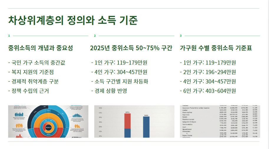 중위소득은 국민 가구 소득의 중간값으로, 복지 지원의 기준이 됩니다. 2025년 기준 중위소득은 4인 가구를 기준으로 월 6,097,773원입니다. 이에 따라 중위소득 50~75%에 해당하는 소득 범위는 다음과 같습니다.