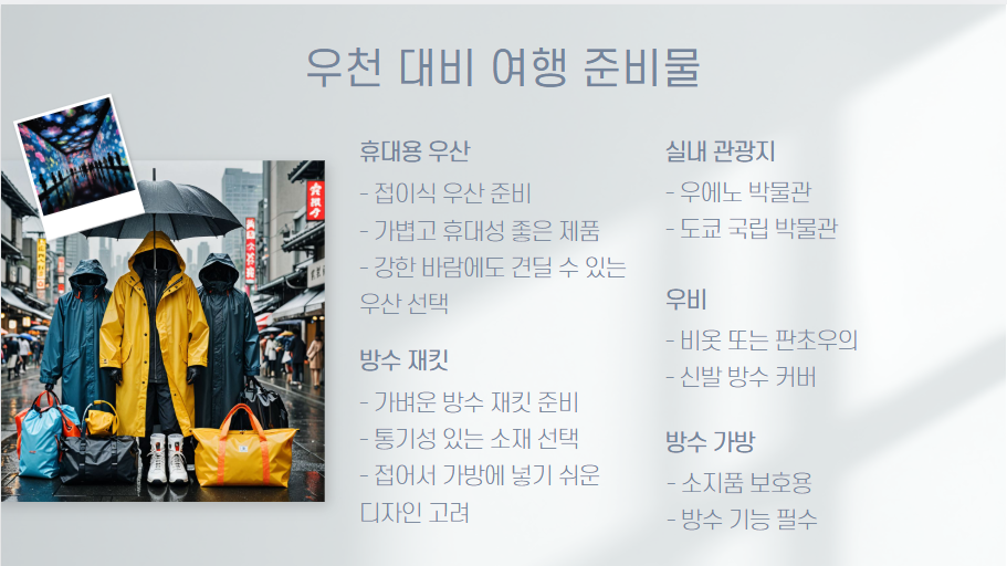 ✅ 비 올 가능성이 있으므로 우산과 방수 재킷 필수