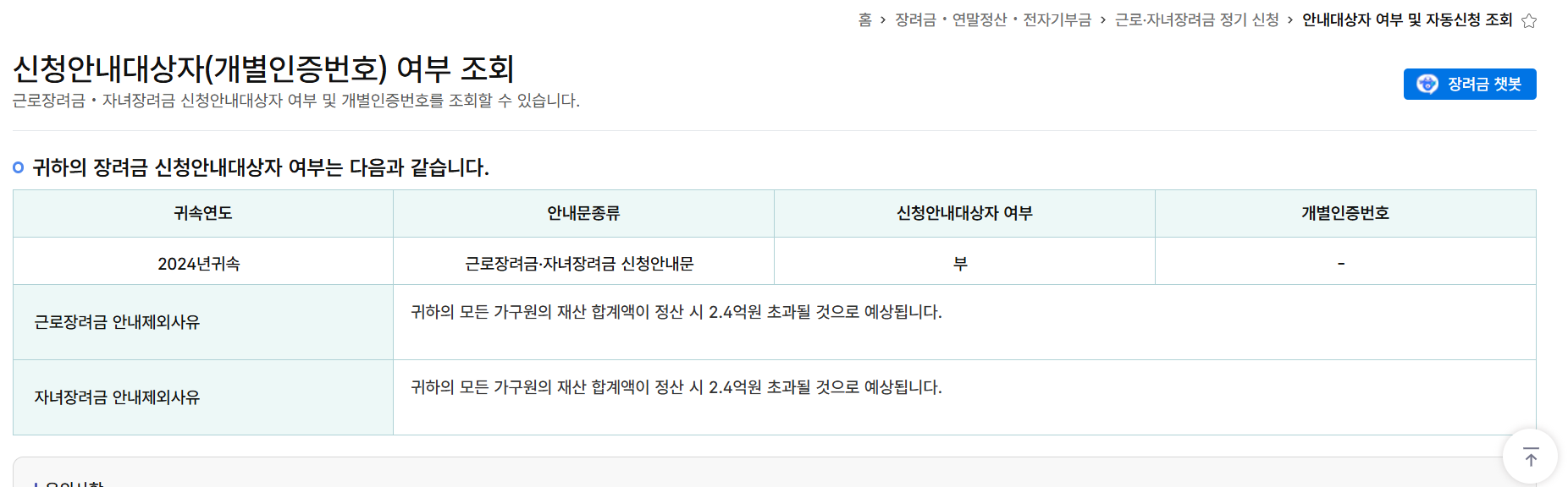 신청 안내 대상자에 포함되지 않음을 확인하였습니다. 안내 제외 사유를 여기에서 확인할 수 있습니다. 저는 가구원의 재산 합계액이 정산 시 2.4억 원 초과될 것으로 예상됩니다.라는 안내를 받았습니다. 하지만 제가 계산한 바로는 2.4억 원이 넘지 않고 그동안도 재산변화 없이 매년 별도로 신청해서 지원금을 받았기 때문에 확인만 한 후 지원하기로 갑니다.