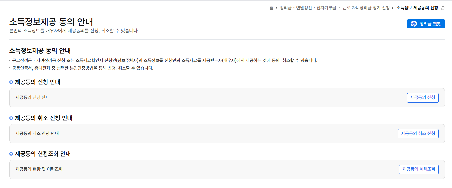 배우자 공인인증서로 홈택스에 새로 로그인 후 홈> 장려금, 연말정산, 전자기부금 > 근로자녀장려금 정기 신청> 소득정보제공동의 신청을 누르고 제공동의 신청 안내 옆에 있는 제공동의 신청 파란 글씨를 클릭합니다.