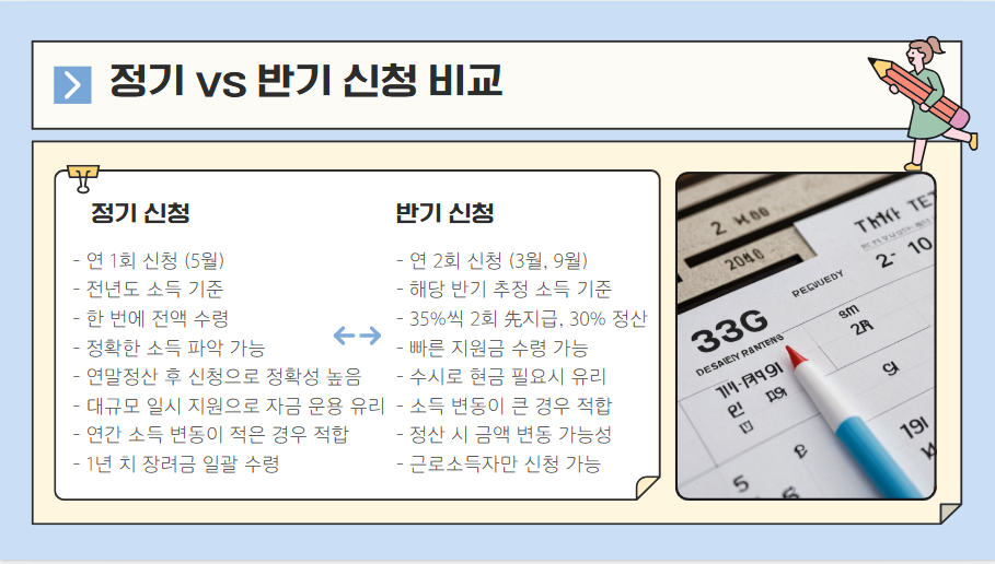 반기 신청: 빠르게 지원받을 수 있지만 연말 정산에 따라 지급액이 조정될 가능성이 있음.