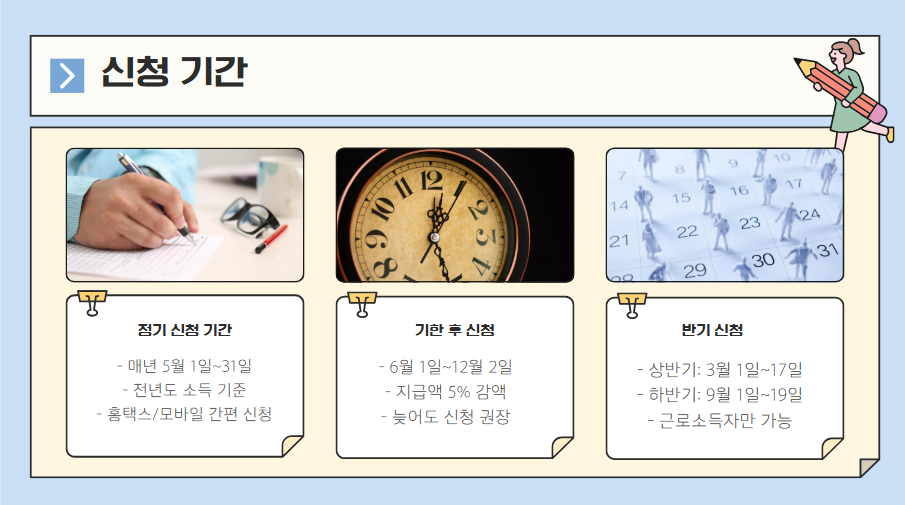 정기 신청 기간을 놓치면 기한 후 신청이 가능하지만 지급액이 5% 줄어들기 때문에, 가급적 정해진 신청 기간 내에 접수하는 것이 유리합니다.