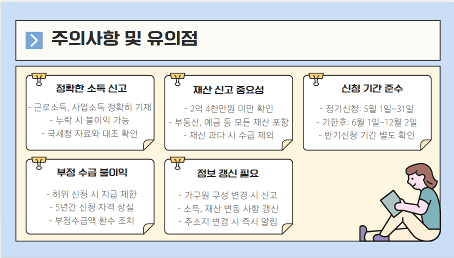 신청 방법도 간편해졌지만, 소득과 재산을 정확히 신고하는 것이 중요합니다. 또한 정기 신청과 반기 신청의 장단점을 잘 따져보고 본인에게 유리한 방법을 선택하는 것이 필요합니다.