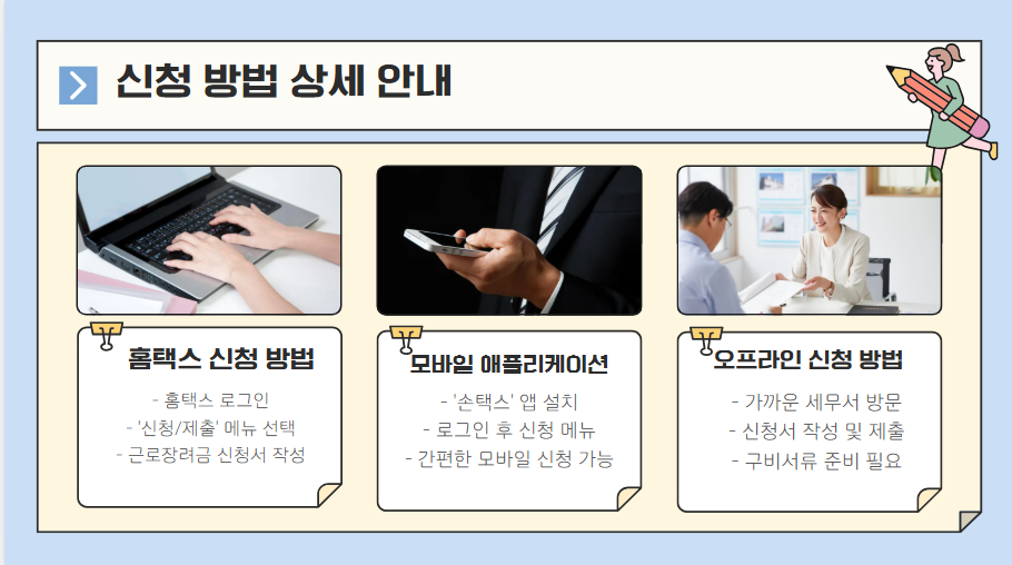 과거에는 신청 시 여러 서류를 제출해야 했지만, 이제는 홈택스 또는 모바일 애플리케이션을 통해 간편하게 신청할 수 있습니다. 이는 신청자의 번거로움을 최소화하여 보다 많은 저소득 근로자가 혜택을 받을 수 있도록 개선된 부분입니다.