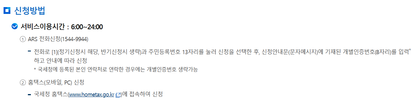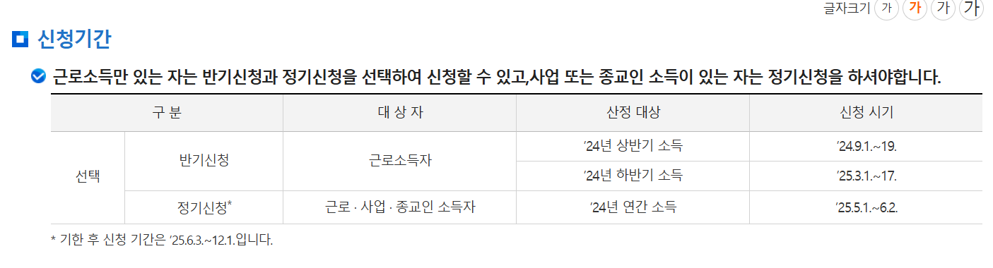 - 반기 신청: 상반기 3월, 하반기 9월 신청 (소득 귀속 시기별)
