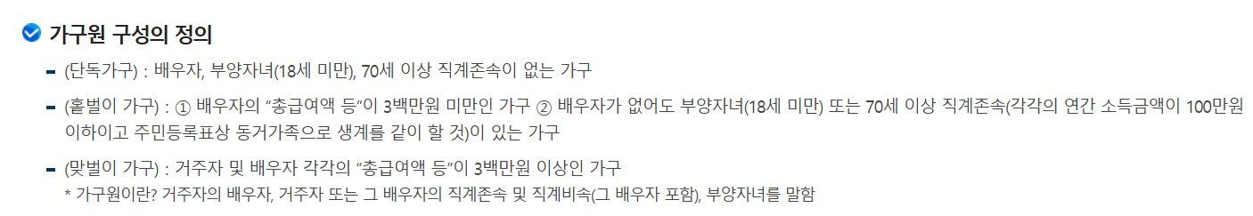 - 소득 요건: 단독 가구, 홑벌이 가구, 맞벌이 가구에 따라 기준 다름