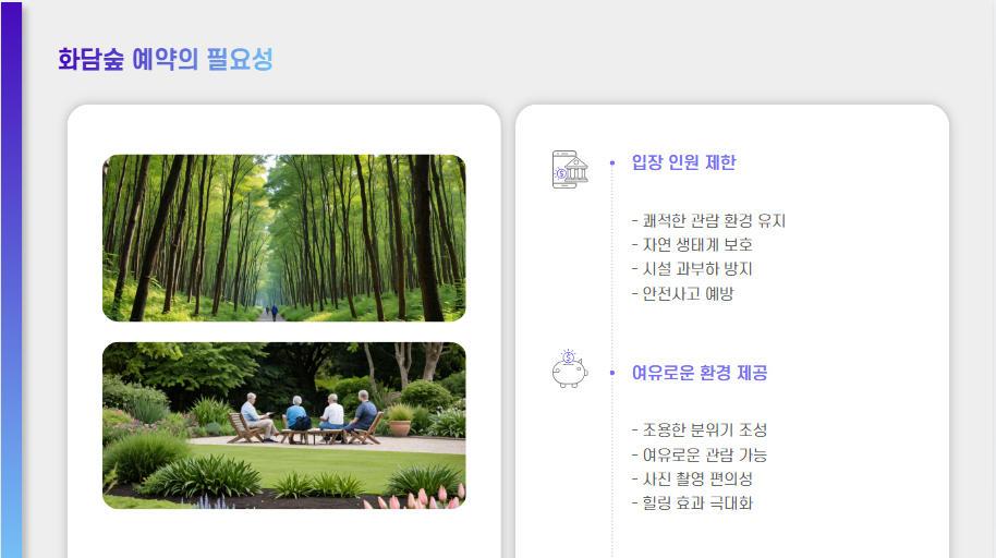 - 방문 날짜 및 시간 선택: 달력을 통해 원하는 방문 날짜와 시간을 선택합니다. 화담숲은 방문일 기준 31일 전부터 예약 가능하므로, 미리 예약하시는 것을 권장합니다.