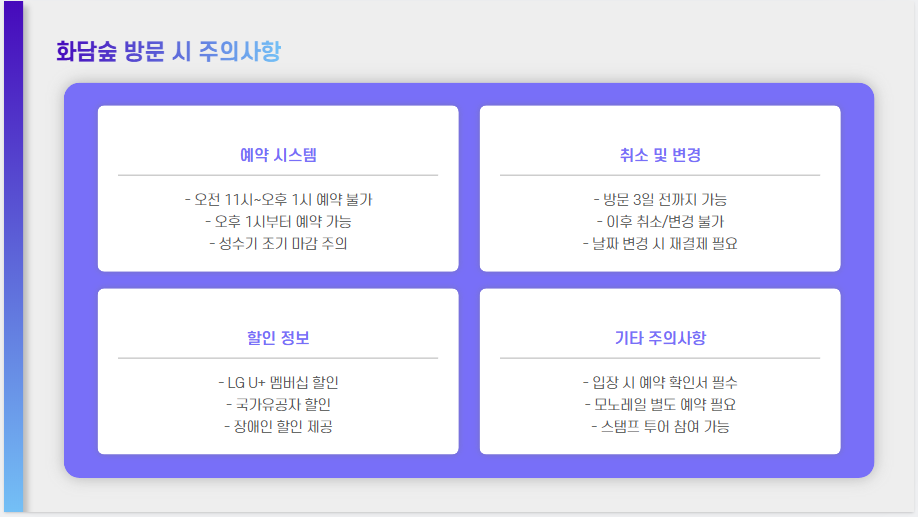 - 취소 및 변경: 예약 취소 및 변경은 방문일 기준 3일 전까지 가능하며, 이후에는 취소가 불가능하니 일정을 신중하게 계획하세요.