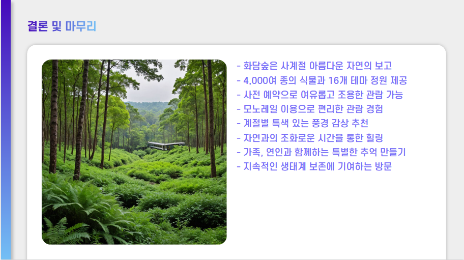 🔹 모노레일 운영 – 이동이 불편한 방문객도 편안하게 숲을 감상 가능