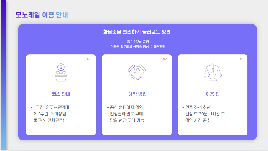- 모노레일 이용: 사전 예약제로 운영되며, 지정된 시간에 탑승해야 합니다. 중간 하차 및 재탑승은 불가능합니다.