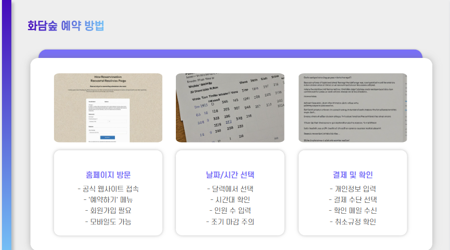 - 예약 확인: 결제가 완료되면 예약 확인서가 이메일 또는 문자 메시지로 발송됩니다. 방문 당일 입장 시 이 확인서를 제시하셔야 하므로, 반드시 지참하시기 바랍니다.