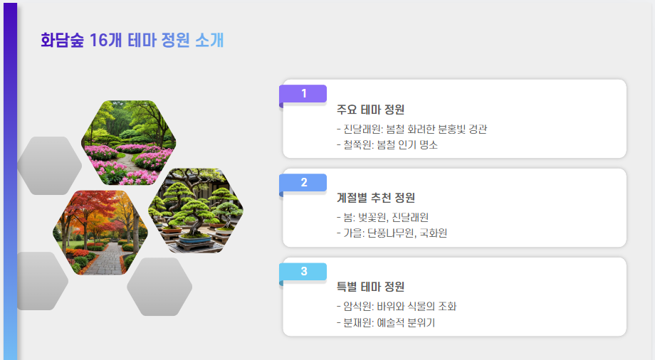 - 철쭉원 – 철쭉꽃이 가득한 공간으로, 봄철 방문객들에게 인기 있는 장소입니다.
