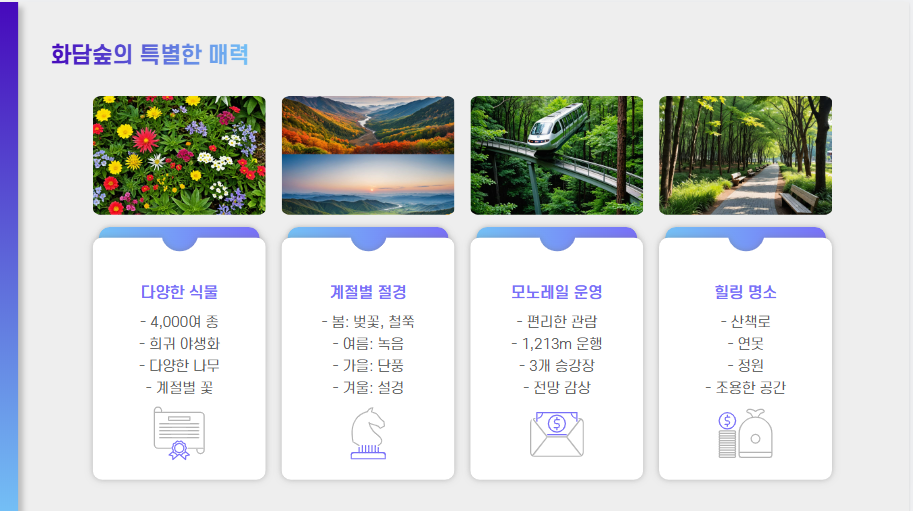 🔹 모노레일 운영 – 이동이 불편한 방문객도 편안하게 숲을 감상 가능
