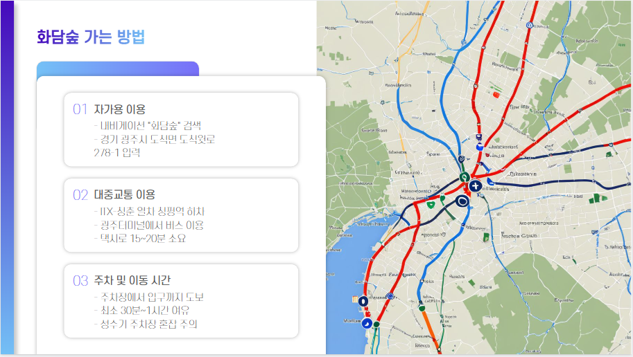 🚗 자가용 이용 시 – 내비게이션에서 "화담숲" 검색 후 이동 (주차 가능하나 성수기에는 혼잡할 수 있음)