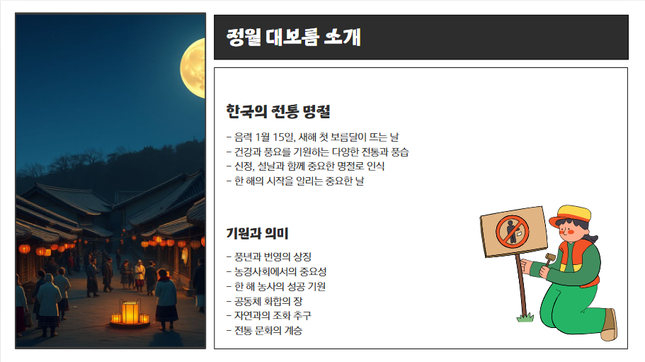오늘날에도 많은 사람들이 정월 대보름을 맞아 보름달을 바라보며 소원을 빌고, 가족과 함께 특별한 음식을 나누며 전통놀이를 즐깁니다. 자연과 조화를 이루며 한 해의 행복과 건강을 기원하는 날, 정월 대보름의 문화는 지금도 한국인의 삶 속에서 의미 있게 이어지고 있습니다!